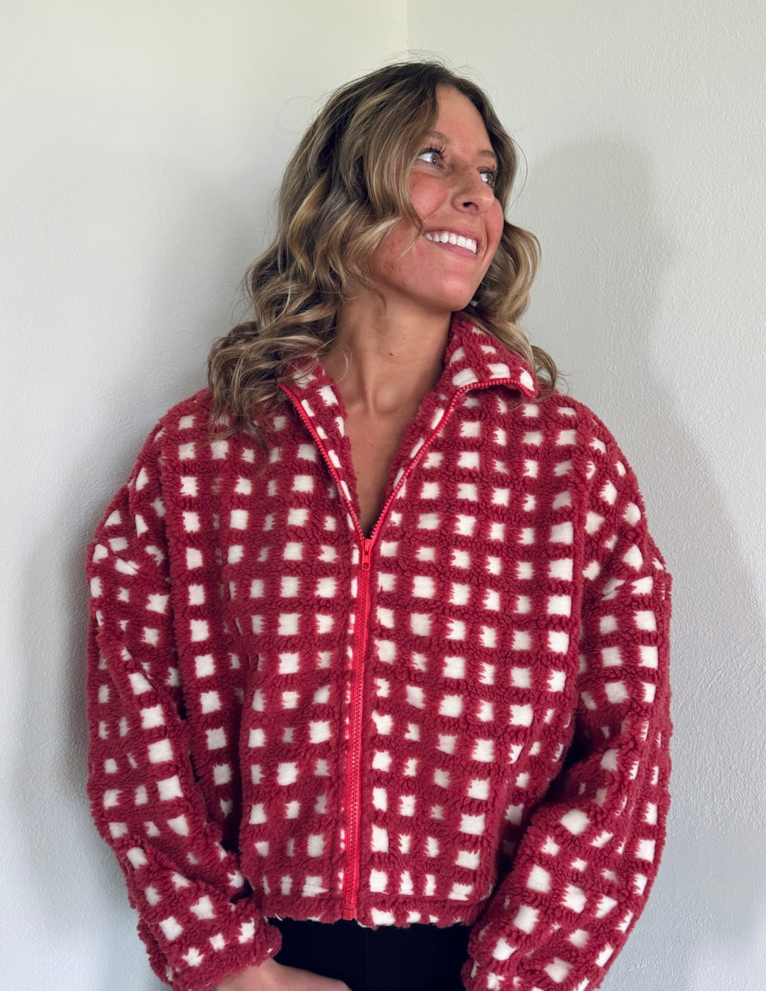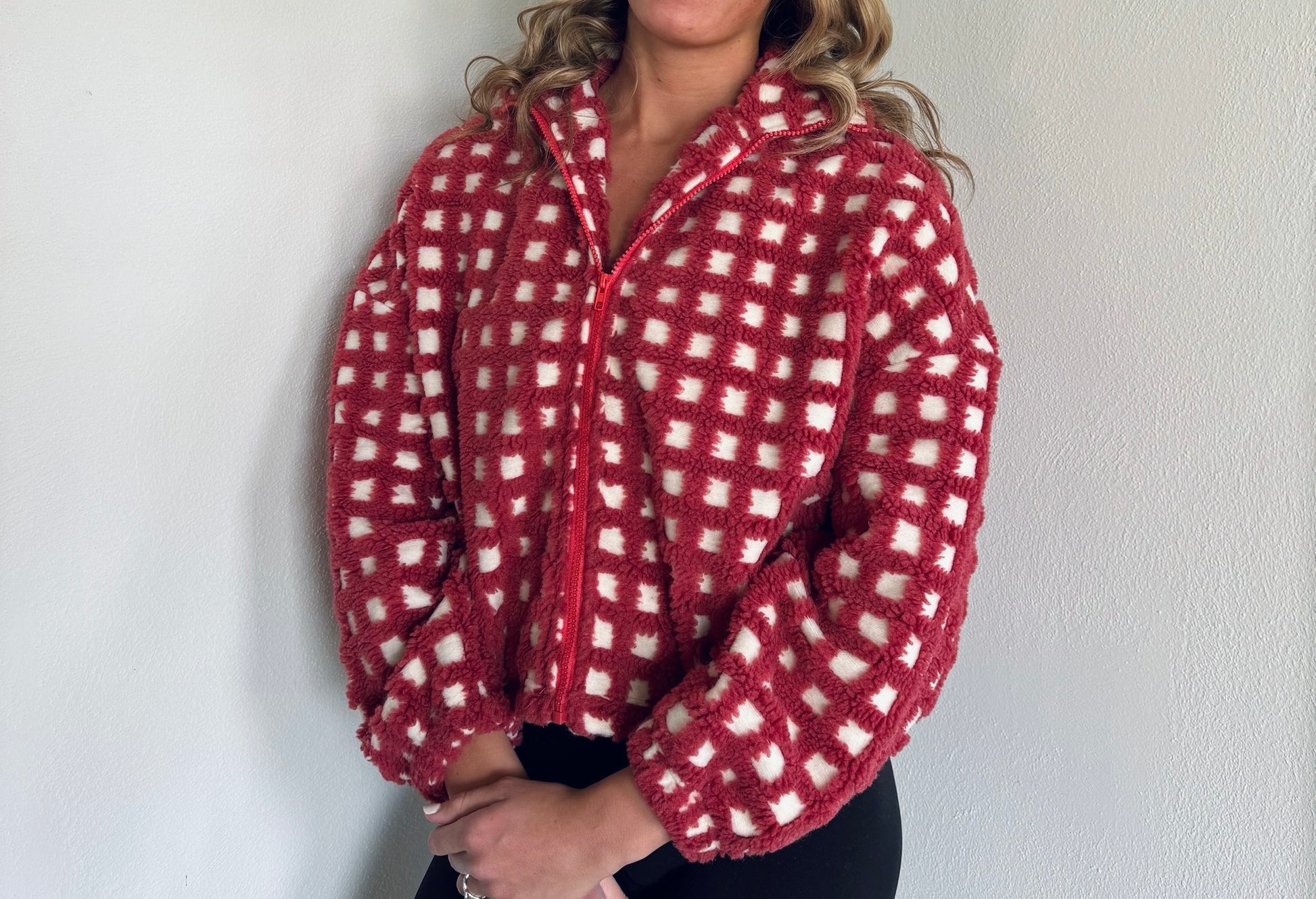 This Checkered Red Sherpa Jacket features a bold gingham pattern and ultra-soft sherpa texture. Designed with a relaxed fit and easy zip-front, it’s your go-to for chilly days, coffee runs, and effortless layering all season long. This oversized layer is the perfect mix of statement and comfort.